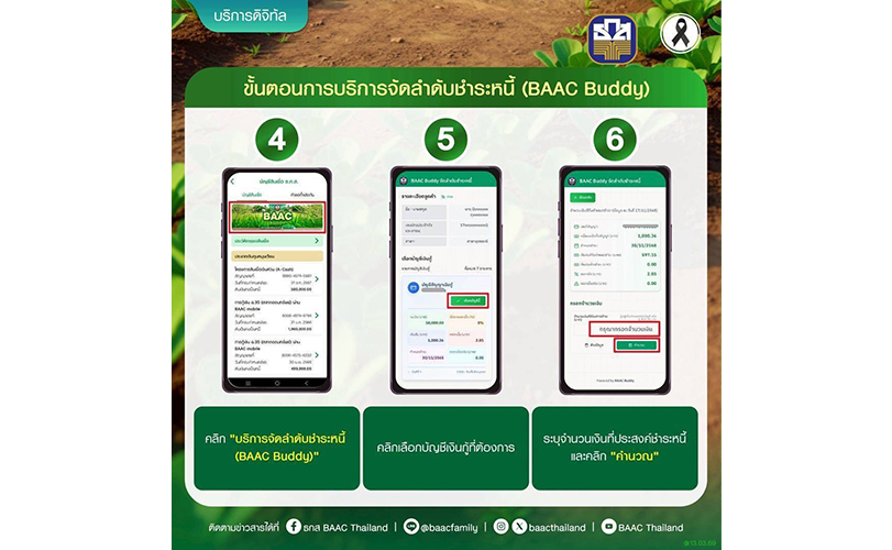 นายฉัตรชัย ศิริไล ผู้จัดการธนาคารเพื่อการเกษตรและสหกรณ์การเกษตร (ธ.ก.ส.) กล่าวว่า ธ.ก.ส. ได้นำเทคโนโลยีและนวัตกรรมฟีเจอร์ใหม่ผ่านแอปพลิเคชัน BAAC Mobile ภายใต้ชื่อ “BAAC Buddy” มาช่วยตอบโจทย์ของเกษตรกรที่มีหนี้หลายสัญญาและตรวจเช็คว่าหนี้สัญญาใดที่จะครบกำหนด พร้อมการแนะนำการชำระหนี้ของเกษตรกรที่จะได้รับประโยชน์สูงสุด ซึ่งนอกจากเป็นการรักษาวินัยทางการเงิน ที่เป็นการสร้างเครดิตให้กับลูกค้าแล้วยังช่วยในเรื่องของการลดภาระดอกเบี้ย และโอกาสในการรับสิทธิพิเศษจากโครงการต่าง ๆ ของรัฐที่เข้ามาสนับสนุน รวมถึงโปรโมชันที่ธนาคารจัดขึ้น ซึ่งฟีเจอร์ดังกล่าวจะทำให้เกษตรกรรับรู้สถานะหนี้ของตนเองได้ทุกที่ ทุกเวลา สะดวกสบาย และสามารถกำหนดลำดับความสำคัญของการชำระหนี้แต่ละบัญชีได้ด้วยตนเอง เช่น แผนการผ่อนชำระให้เหมาะสมกับกระแสเงินสดรับในแต่ละเดือน ไม่ว่าจะเป็นการเลือกชำระหนี้ก่อนครบกำหนด โดยระบบจะช่วยคำนวณและแนะนำแนวทางการชำระหนี้ที่เหมาะสมแบบเรียลไทม์ นอกจากนี้ ยังมาพร้อมเครื่องมือวิเคราะห์ ภาระหนี้โดยรวมของผู้ใช้งานแสดงภาพรวมของยอดคงค้าง อัตราดอกเบี้ย และระยะเวลาการชำระหนี้ เพื่อช่วยให้ลูกค้า สามารถตัดสินใจทางการเงินได้แบบมีข้อมูลรองรับ และยังช่วยลดค่าใช้จ่ายการเดินทาง เพราะสามารถชำระหนี้ผ่าน แอปพลิเคชัน BAAC Mobile ได้ทันที ทั้งกรณีชำระปกติ หรือชำระตามโปรโมชันที่ธนาคารกำหนด อาทิ “ชำระดี มีเงินคืน (Cash Back)” ภายใต้โครงการ ชำระดีมีโชค (สิ้นสุด 31 มีนาคม 2569) และแคมเปญ “BAAC Buddy จ่ายดี มีวินัยได้เงิน” (สิ้นสุด 30 เมษายน 2569) เป็นต้น
