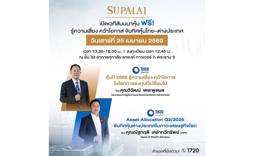 ขอเชิญผู้ที่สนใจการลงทุน การวางแผนการเงิน และประชาชนทั่วไป ร่วมงานสัมมนา “หุ้นปี 2569: รู้ความเสี่ยง คว้าโอกาส จับทิศหุ้นไทย-ต่างประเทศ” อัปเดตมุมมองตลาด พร้อมวิเคราะห์ทิศทางหุ้นไทยและต่างประเทศ เพื่อค้นหาโอกาสการลงทุนใหม่ในโลกการเงินที่เปลี่ยนแปลงอย่างรวดเร็ว ในวันเสาร์ที่ 25 เมษายน 2569 เวลา 12.45-16.00 น. ณ ชั้น 33 อาคารศุภาลัย แกรนด์ ทาวเวอร์ พระราม 3 เข้าร่วมฟรี! ไม่มีค่าใช้จ่าย