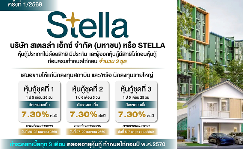 บมจ.สเตลล่า เอ็กซ์ (STELLA) เตรียมขายหุ้นกู้ 3 ชุดรวด แบบมีหลักประกัน รวมมูลค่าไม่เกิน 412 ล้านบาท พร้อมเสิร์ฟดอกเบี้ยสะใจ 7.30% ต่อปี!! เสนอขายสถาบันและนักลงทุนรายใหญ่ เปิดจองซื้อวันที่ 20 เม.ย. – 7 พ.ค. 69 งานนี้ไม่ต้องห่วงเรื่องวินัยการเงิน เพราะที่ผ่านมาสามารถจ่ายดอกเบี้ย–เงินต้น ครบ ตรงเวลาเป๊ะทุกรุ่น ส่วนเงินที่ระดมทุนรอบนี้เตรียมนำไปเป็นเงินทุนหมุนเวียน พร้อมเคลียร์หุ้นกู้เดิมที่ครบกำหนด... เรียกว่าจัดการการเงินแบบมืออาชีพสุดๆ ใครกำลังเล็งมองหาการลงทุนดอกเบี้ยสวยๆ บอกเลยห้ามพลาด
