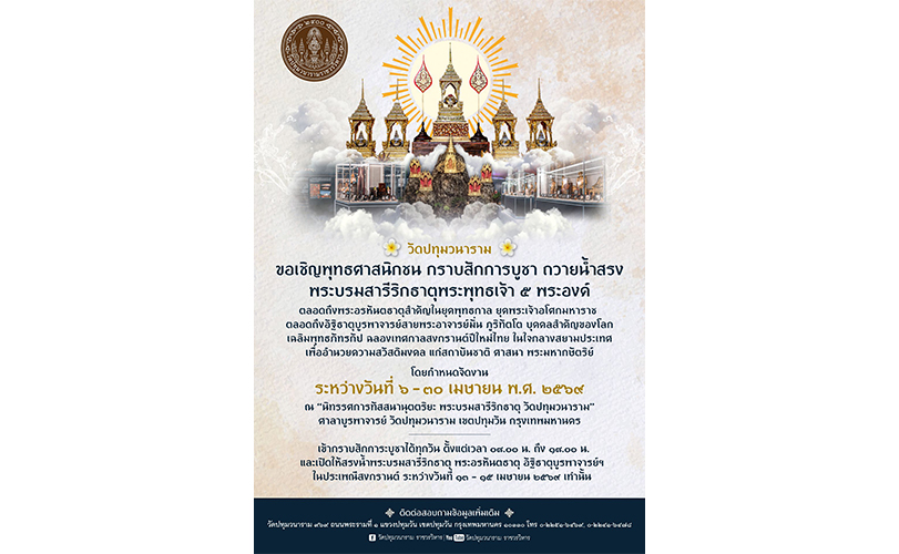 วัดปทุมวนาราม ราชวรวิหาร ใจกลางกรุงเทพมหานคร เปิดประสบการณ์ทางศาสนาครั้งสำคัญ เชิญพุทธศาสนิกชนและประชาชนร่วมกราบสักการะ “พระบรมสารีริกธาตุพระพุทธเจ้า 5 พระองค์” ที่ถูกรวมไว้ในพื้นที่เดียวกันอย่างสมบูรณ์ ภายในนิทรรศการ “ทัสสนานุตตริยะ” พร้อมเปิดโอกาสให้ร่วมสรงน้ำเพื่อความเป็นสิริมงคลในช่วงเทศกาลปีใหม่ไทย