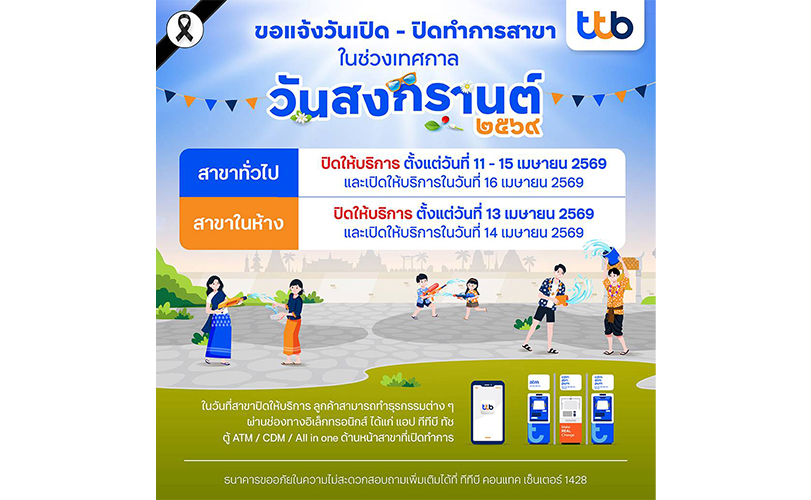 สำหรับวันเปิด – ปิดทำการสาขาในช่วงเทศกาลสงกรานต์ ปี 2569 ทีทีบีสาขาทั่วไป จะปิดให้บริการตั้งแต่วันที่ 11 เมษายน 2569 – 15 เมษายน 2569 และเปิดให้บริการในวันที่ 16 เมษายน 2569 สำหรับสาขาในห้างสรรพสินค้า จะปิดให้บริการในวันที่ 13 เมษายน 2569 และเปิดให้บริการในวันที่ 14 เมษายน 2569