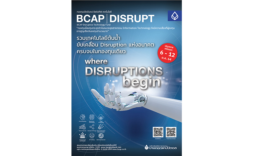 สำหรับจุดเด่นของกองทุน BCAP –DISRUPT เป็นกองทุน Thematic ที่ลงทุนในเทคโนโลยีต้นน้ำที่ขับเคลื่อนให้เกิดนวัตกรรมใหม่เพื่อรับมือกับ Disruption ในอนาคต และลงทุนผ่านกองทุนของหลากหลาย บลจ. ทั่วโลกไม่จำกัดการลงทุนใน บลจ. ใด บลจ.หนึ่ง ทำให้เข้าถึงหลักทรัพย์ได้กว่า 500 หลักทรัพย์ รวมทั้งมุ่งเน้นการกระจายความเสี่ยงโดยจัดพอร์ตการลงทุนให้ครอบคลุมหลากหลายธีมการลงทุนและกลุ่มธุรกิจ ที่ได้ประโยชน์จากการประกอบธุรกิจที่เกี่ยวข้องกับเทคโนโลยีใหม่ที่เป็นพื้นฐานเพื่อการต่อยอดนวัตกรรมที่จะพลิกโฉมธุรกิจและอุตสาหกรรมต่างๆในอนาคต เช่น Autonomous and Robotics, Artificial Intelligence/ Machine Learning and Big Data, Distributed Ledger, Cloud and NextGen Computing, Internet of Things, 5G/ NextG Wireless, Space Exploration เป็นต้น