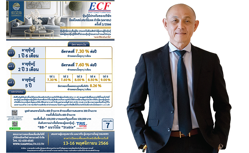นายอารักษ์ สุขสวัสดิ์ กรรมการผู้จัดการ บริษัท อีสต์โคสท์เฟอร์นิเทค จำกัด (มหาชน) (ECF) เปิดเผยว่า บริษัทได้ยื่นแบบร่างแบบแสดงรายการต่อสำนักงานคณะกรรมการกำกับหลักทรัพย์และตลาดหลักทรัพย์ (ก.ล.ต.) สำหรับการเสนอขายหุ้นกู้มีประกันของบริษัท อีสต์โคสท์เฟอร์นิเทค จำกัด (มหาชน) ครั้งที่ 2/2566 ชนิดระบุชื่อผู้ถือ ไม่ด้อยสิทธิ มีประกัน และมีผู้แทนผู้ถือหุ้นกู้ จำนวน 3 ชุด ได้แก่ ชุดที่ 1 ครบกำหนดไถ่ถอนปี พ.ศ. 2568 ซึ่งผู้ออกหุ้นกู้มีสิทธิไถ่ถอนหุ้นกู้ก่อนครบกำหนดไถ่ถอน (หุ้นกู้ชุดที่ 1) อัตราดอกเบี้ยคงที่ร้อยละ 7.30 ต่อปี ตลอดอายุหุ้นกู้ อายุหุ้นกู้ 1 ปี 6 เดือน ชำระดอกเบี้ยทุก 3 เดือน ตลอดอายุหุ้นกู้