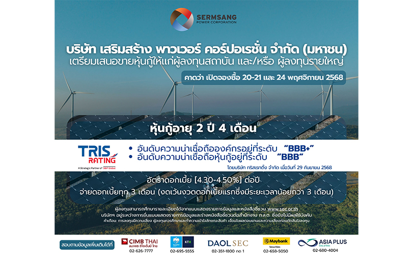 บมจ.เสริมสร้าง พาวเวอร์ คอร์ปอเรชั่น (SSP) เตรียมเสนอขายหุ้นกู้ชุดใหม่ ครั้งที่ 3/2568 อายุหุ้นกู้ 2 ปี 4 เดือน อัตราดอกเบี้ยคงที่ [4.30 - 4.50]% ต่อปี เสนอขายให้แก่ผู้ลงทุนสถาบันและผู้ลงทุนรายใหญ่ คาดว่าจะเปิดจองซื้อระหว่างวันที่ 20 – 21 และ 24 พฤศจิกายน 2568