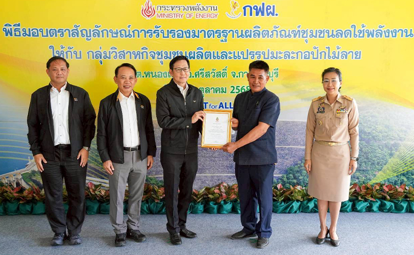 การมอบตราสัญลักษณ์การรับรองมาตรฐาน “ผลิตภัณฑ์ชุมชน ลดใช้พลังงาน” ในครั้งนี้ เป็นส่วนหนึ่งของโครงการส่งเสริมการจำหน่ายผลิตภัณฑ์ ลดใช้พลังงาน โดยใช้สถานีบริการน้ำมันเชื้อเพลิงเป็นช่องทางจัดจำหน่ายโดยผลิตภัณฑ์ “กล้วยตากทอดกรอบ” ของวิสาหกิจชุมชนผลิตและแปรรูปมะละกอปักไม้ลาย ได้รับการสนับสนุนจาก กฟผ. ร่วมกันพัฒนาต่อยอดกล้วยตากเป็นผลิตภัณฑ์ใหม่ คือ กล้วยตากทอดกรอบ เพื่อเพิ่มมูลค่าในรูปแบบขนมขบเคี้ยว ตอบโจทย์ผู้บริโภคกลุ่มวัยทำงานและวัยรุ่น โดยนำกล้วยน้ำว้าออร์แกนิคที่มีเนื้อนุ่มหวานฉ่ำ ตากด้วยพลังงานแสงอาทิตย์ ผ่านกรรมวิธีการทอดและอบไล่น้ำมัน บรรจุของขนาดพกพาสะดวก เหมาะสำหรับรับประทานเป็นอาหารว่างที่ดีต่อสุขภาพ