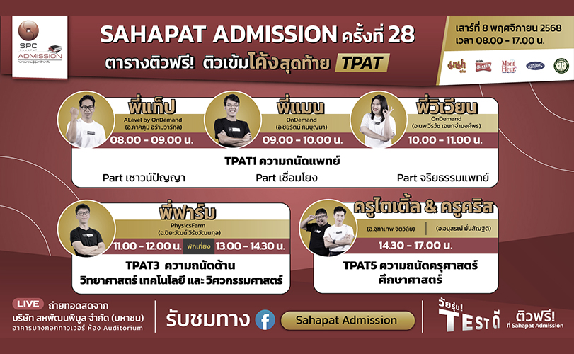 โครงการ “Sahapat Admission” ปีที่ 28 มหกรรมติวฟรีแห่งปี ที่เข้มข้น ครอบคลุมทุกเนื้อหาสำคัญ จัดโดยบริษัท สหพัฒนพิบูล จำกัด (มหาชน) หรือ SPC ร่วมกับผลิตภัณฑ์มาม่า บิสชิน มองต์เฟลอ ริชเชส และมูลนิธิ ดร.เทียม โชควัฒนา พร้อมส่งน้อง ๆ #DEK69 ให้ถึงฝั่งฝันกับกิจกรรม “ติวเข้มโค้งสุดท้าย TPAT” ในวันเสาร์ที่ 8 พฤศจิกายน 2568 เวลา 08.00-17.00 น. โดยถ่ายทอดสดจากบริษัท สหพัฒนพิบูล จำกัด (มหาชน) อาคารบางกอกทาวเวอร์ ห้อง Auditorium #DEK69 วัยรุ่น TEST ดี รับชมพร้อมกันทั่วประเทศได้ทาง Facebook Live: Sahapat Admission