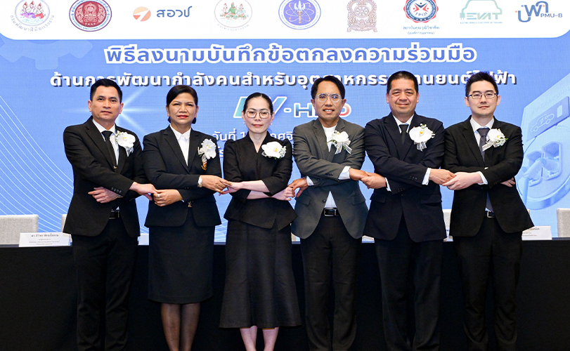 นายสุโรจน์ เเสงสนิท นายกสมาคมยานยนต์ไฟฟ้าไทย พร้อมด้วย ผู้บริหารระดับสูงจาก 5 หน่วยงานพันธมิตร อันได้แก่ นายสมชาติ สุภารี รองอธิบดีกรมพัฒนาฝีมือแรงงาน, นางบัญชาลักษณ์ ลือสวัสดิ์ ที่ปรึกษาด้านมาตรฐานอาชีวศึกษาธุรกิจและบริการ สำนักงานคณะกรรมการการอาชีวศึกษา, ดร.สิริพร พิทยโสภณ รองผู้อำนวยการสำนักงานสภานโยบายการอุดมศึกษา วิทยาศาสตร์ วิจัยและนวัตกรรมแห่งชาติ (สอวช.), นายนิธิวัชร์ ศิริปริยพงศ์ รองผู้อำนวยการสถาบันคุณวุฒิวิชาชีพ (องค์กรมหาชน) และ ดร.รัฐภูมิ ตู้จินดา รองผู้อำนวยการ หน่วยบริหารและจัดการทุนด้านการพัฒนากำลังคนและทุนด้านการพัฒนาสถาบันอุดมศึกษา การวิจัยและการสร้างนวัตกรรม ร่วมลงนามบันทึกข้อตกลงความร่วมมือด้านการพัฒนากำลังคนสำหรับอุตสาหกรรมยานยนต์ไฟฟ้า (EV-HRD) และการประชุมประชาพิจารณ์เพื่อรับฟังความคิดเห็น “โครงการศึกษาเพื่อจัดทำข้อเสนอแนะเชิงนโยบายการพัฒนากำลังคน สำหรับอุตสาหกรรมยานยนต์สมัยใหม่ (EV-HRD)” ณ ห้องกมลทิพย์บอลรูม โรงแรม เดอะ สุโกศล กรุงเทพมหานคร
