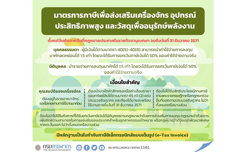 2. มาตรการภาษีเพื่อส่งเสริมเครื่องจักร อุปกรณ์ประสิทธิภาพสูง และวัสดุเพื่อการอนุรักษ์พลังงาน ให้บุคคลธรรมดาซึ่งมีเงินได้พึงประเมินตามมาตรา 40 (5) (6) (7) และ (8) แห่งประมวลรัษฎากรหักค่าใช้จ่ายในการลงทุนและบริษัทหรือห้างหุ้นส่วนนิติบุคคลหักรายจ่ายในการลงทุนได้ 1.5 เท่า โดยการยกเว้นภาษีเงินได้บุคคลธรรมดาและภาษีเงินได้นิติบุคคลเป็นจำนวนร้อยละ 50 ของเงินได้เท่าที่ได้จ่ายเป็นค่าใช้จ่ายในการลงทุนในเครื่องจักร อุปกรณ์ประสิทธิภาพสูง หรือวัสดุเพื่อการอนุรักษ์พลังงานที่มีผลต่อการประหยัดพลังงาน ซึ่งได้รับการรับรองฉลากแสดงระดับประสิทธิภาพพลังงานระดับ 5 ดาวจาก กรมพัฒนาพลังงานทดแทนและอนุรักษ์ ที่ได้จ่ายให้แก่ผู้ประกอบการจดทะเบียนภาษีมูลค่าเพิ่ม และได้รับใบกำกับภาษีอิเล็กทรอนิกส์ (e-Tax Invoice) ตั้งแต่วันที่พระราชกฤษฎีกานี้มีผลใช้บังคับถึงวันที่ 31 ธันวาคม 2571