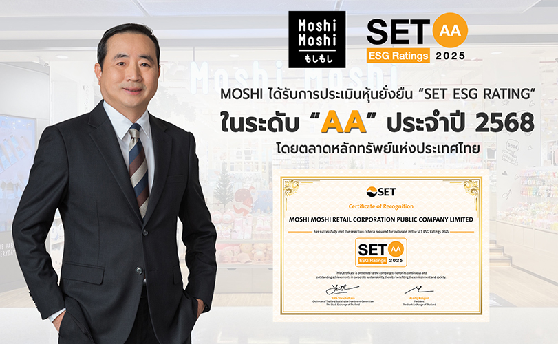 บมจ. โมชิ โมชิ รีเทล คอร์ปอเรชั่น หรือ MOSHI ได้รับการประเมินหุ้นยั่งยืน SET ESG Ratings ระดับ “AA” ประจำปี 2568 จากตลาดหลักทรัพย์แห่งประเทศไทย ตอกย้ำความสำเร็จในการพัฒนาธุรกิจอย่างยั่งยืน (ESG) ครอบคลุมทั้งมิติสิ่งแวดล้อม สังคม และบรรษัทภิบาล พร้อมขับเคลื่อนธุรกิจภายใต้แนวคิด ‘Make Sustainability part of Your Everyday Life’ สร้างการเติบโตอย่างมั่นคงและยั่งยืนร่วมกับผู้มีส่วนได้เสียทุกภาคส่วน