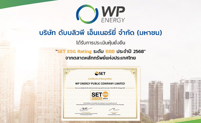 บริษัท ดับบลิวพี เอ็นเนอร์ยี่ จำกัด (มหาชน) (WP) ได้รับการประเมินหุ้นยั่งยืน SET ESG Ratings ประจำปี 2568 ระดับ “BBB” ในกลุ่มทรัพยากร (Resource) จากการประกาศผลประเมินหุ้นยั่งยืน ประจำปี 2568 ของตลาดหลักทรัพย์แห่งประเทศไทย ซึ่งเป็นปีแรกของบริษัทฯ ในการเข้าร่วมการประเมินดังกล่าว สะท้อนให้เห็นถึงศักยภาพการดำเนินธุรกิจของ WP ที่ให้ความสำคัญต่อการดำเนินธุรกิจอย่างยั่งยืน และถือเป็นเครื่องยืนยันถึงความตั้งใจในการดำเนินงานให้สอดคล้องกับพันธกิจด้านความยั่งยืน “WE PROMISE” ของบริษัทฯ ภายใต้กรอบ ESG (Environmental, Social and Governance) ในทุกมิติ เพื่อสร้างคุณค่าให้แก่ผู้มีส่วนได้เสียและแสดงให้เห็นถึงศักยภาพการเติบโตขององค์กรในระยะยาว