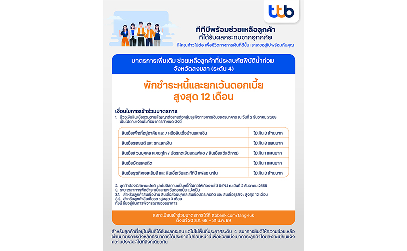 ทีเอ็มบีธนชาต หรือ ทีทีบี ห่วงใยและพร้อมเคียงข้างลูกค้าที่ได้รับผลกระทบจากสถานการณ์อุทกภัยในหลายพื้นที่ของภาคใต้ในช่วงที่ผ่านมา โดยเฉพาะในจังหวัดสงขลา ซึ่งเป็นพื้นที่สาธารณภัยร้ายแรงอย่างยิ่ง ระดับ 4 ซึ่งสร้างความเสียหายอย่างรุนแรงต่อชีวิต ทรัพย์สิน การดำเนินธุรกิจและความเป็นอยู่ของประชาชนในวงกว้าง ทีทีบีจึงออกมาตรการช่วยเหลือเพิ่มเติม ตามแนวทางของธนาคารแห่งประเทศไทย “พักชำระหนี้และยกเว้นดอกเบี้ยสูงสุด 12 เดือน” สำหรับลูกค้าที่ได้รับผลกระทบในจังหวัดสงขลา เพื่อบรรเทาภาระทางการเงินของลูกค้าช่วยให้ภาคครัวเรือนและภาคธุรกิจสามารถกลับมาประกอบอาชีพ หรือดำเนินธุรกิจได้โดยเร็ว