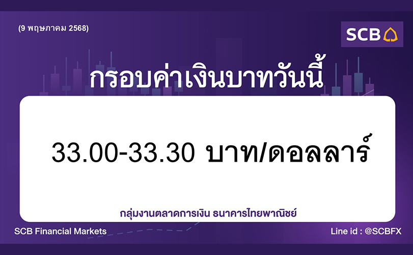 กลุ่มงานตลาดการเงิน ธนาคารไทยพาณิชย์ ประเมินค่าเงินบาท 9 พฤษภาคม 2568 เคลื่อนไหวในกรอบ 33.00-33.30 บาท/ดอลลาร์