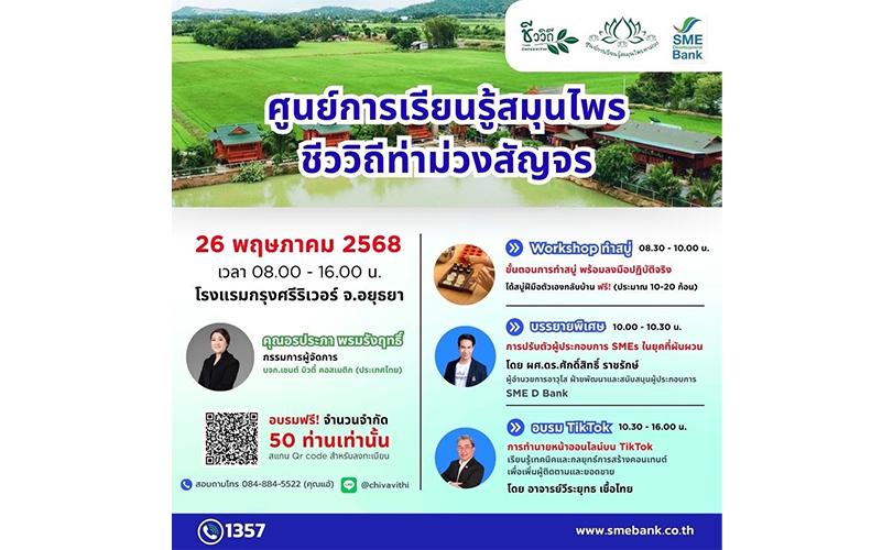 ศูนย์การเรียนรู้สวนสมุนไพรชีววิถีท่าม่วง จังหวัดกาญจนบุรี เตรียมจัดกิจกรรมนอกสถานที่เป็นครั้งแรก ในวันที่ 26 พฤษภาคม 2568 เวลา 08.00 – 16.00 น. ณ โรงแรมกรุงศรีริเวอร์ จังหวัดพระนครศรีอยุธยา ภายใต้แนวคิด “สร้างงาน สร้างอาชีพ เสริมรายได้สู่ชุมชน” เพื่อเปิดโอกาสให้ประชาชนทั่วไปได้ร่วมเรียนรู้ทักษะอาชีพต่าง ๆ โดยไม่มีค่าใช้จ่าย