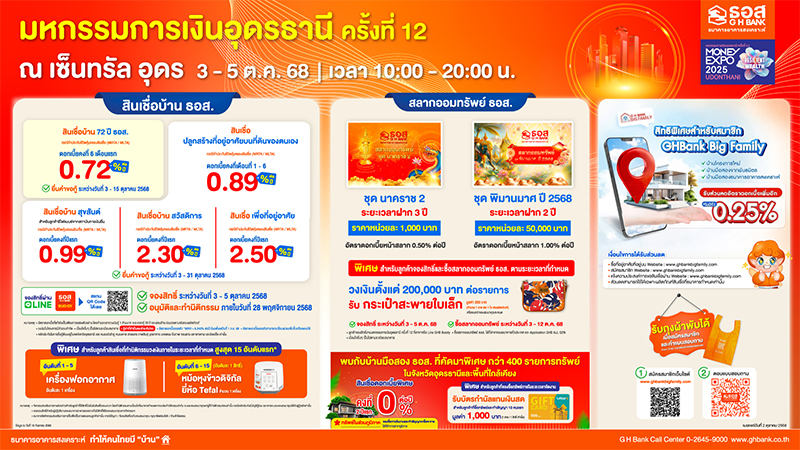 งาน “มหกรรมการเงินอุดรธานี ครั้งที่ 12 MONEY EXPO 2025 UDONTHANI” มีกำหนดจัดขึ้น ณ เซ็นทรัล อุดร ระหว่าง วันที่ 3 – 5 ตุลาคม 2568 ผู้ที่สนใจสามารถสอบถามรายละเอียดเพิ่มเติมได้ที่ ธอส. ทุกสาขาทั่วประเทศ G H Bank Call Center โทร.0-2645-9000 หรือ Facebook Fanpage ธนาคารอาคารสงเคราะห์ และติดตามข่าวสาร ของธนาคารได้ที่ Application : GHB ALL GEN และ www.ghbank.co.th