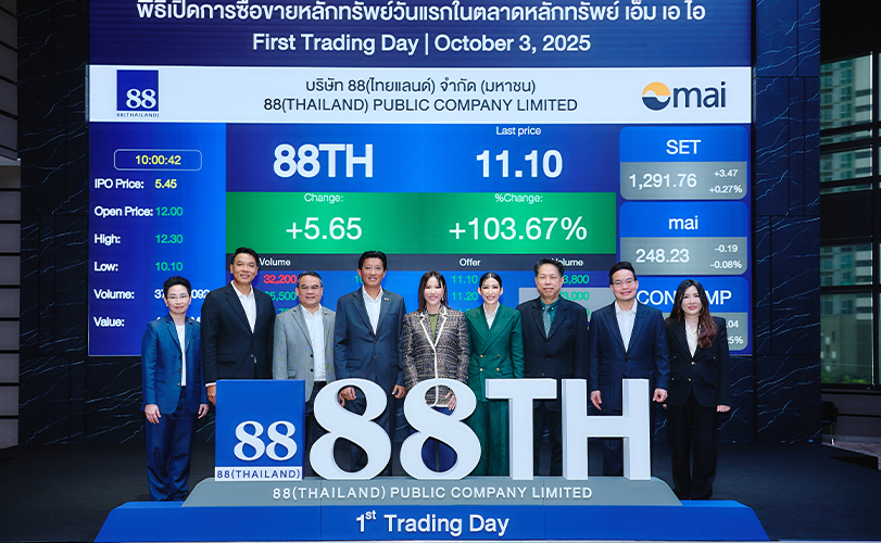 อัสสเดช คงสิริ กรรมการและผู้จัดการ ตลาดหลักทรัพย์แห่งประเทศไทย ประพันธ์ เจริญประวัติ ผู้จัดการตลาดหลักทรัพย์ เอ็ม เอ ไอ พร้อมด้วย ณัฐฐินี ชวนะนิกุล ประธานเจ้าหน้าที่บริหาร และ นพรัตน์ มาลัยวงค์ ผู้ก่อตั้งและกรรมการ บมจ. 88(ไทยแลนด์) ร่วมพิธีเปิดการซื้อขายวันแรกในตลาดหลักทรัพย์ เอ็ม เอ ไอ ของ บมจ. 88(ไทยแลนด์) ผู้ผลิตและจำหน่ายผลิตภัณฑ์ดูแลเส้นผมและหนังศีรษะ “ไลโอ” ผลิตภัณฑ์ดูแลผิว “โฮน” และ เครื่องสำอาง “เวอร์.88” ในวันที่ 3 ตุลาคม 2568 มูลค่าหลักทรัพย์ ณ ราคา IPO 1,158.125 ล้านบาท โดยใช้ชื่อย่อในการซื้อขายหลักทรัพย์ว่า “88TH”