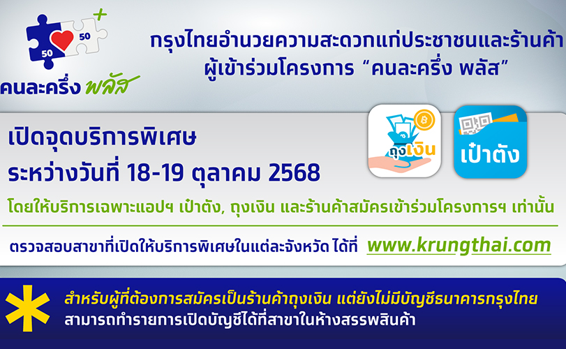กรุงไทย อำนวยความสะดวกแก่ประชาชนและร้านค้า ผู้เข้าร่วมโครงการ “คนละครึ่งพลัส” เปิดจุดบริการพิเศษ รวม 62 สาขาระหว่างวันที่ 18-19 ตุลาคม 2568
