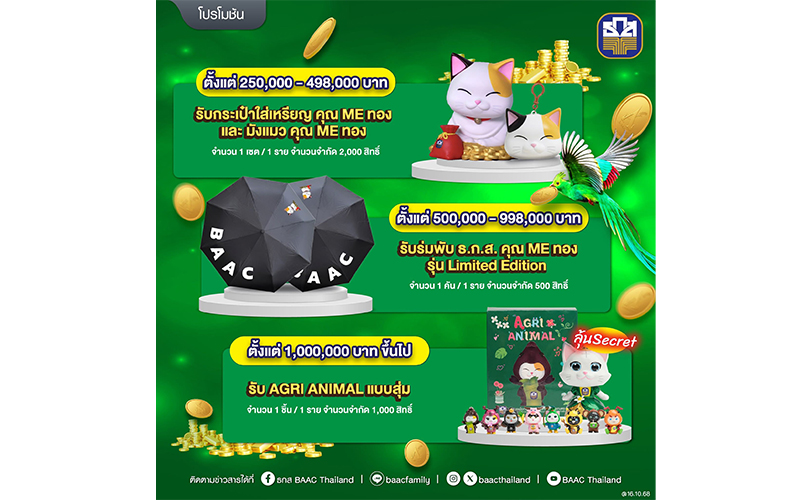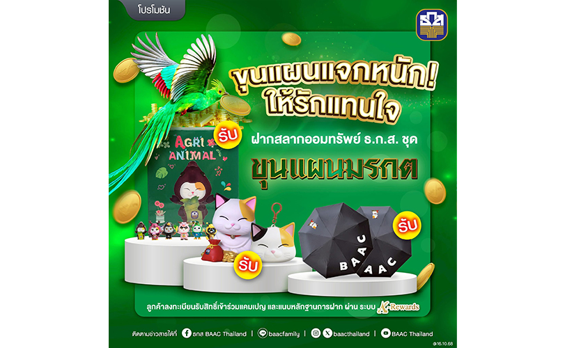รุ่น Limited Edition จำกัด 500 สิทธิ์ และฝากสลากชุดขุนแผนมรกต ตั้งแต่ 1,000,000 บาทขึ้นไป รับเลย AGRI ANIMAL แบบสุ่ม จำนวนจำกัด 1,000 สิทธิ์เท่านั้น ซึ่งจำกัดการร่วมแคมเปญ 1 เงื่อนไข/1ราย/1หลักฐานการรับฝาก ทั้งนี้ ผู้ที่สนใจสามารถเข้าร่วมแคมเปญดังกล่าวตั้งแต่วันที่ 17 ตุลาคม - 31 ธันวาคม 2568 หรือจนกว่าของสมนาคุณจะหมด ได้ที่สาขาของ ธ.ก.ส. ทั่วประเทศ และแอปพลิเคชัน BAAC Mobile พร้อมทั้งแนบหลักฐานการรับฝากผ่านระบบ A-Rewards โดยธนาคารจะจัดส่งของสมนาคุณให้ลูกค้าที่ดำเนินการครบตามเงื่อนไขหลังสิ้นสุดแคมเปญตาม ที่ลูกค้าลงทะเบียนรับสิทธิ์ไว้ สอบถามรายละเอียดเพิ่มเติม Call Center 02 555 0555