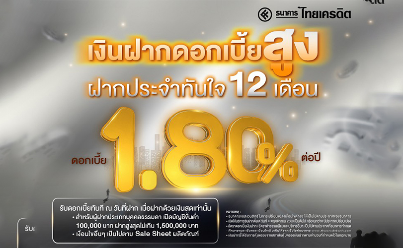 ท่ามกลางกระแสดอกเบี้ยเงินฝากที่ปรับลดลง ธนาคารไทยเครดิต จำกัด (มหาชน) ปรับดอกเบี้ยให้ตอบโจทย์นักออมที่มองหาผลตอบแทนอย่างคุ้มค่าและทันที เปิดตัวโปรโมชันใหม่สวนกระแสตลาดเงินฝาก ด้วย “บัญชีเงินฝากประจำทันใจ 12 เดือน” มอบอัตราดอกเบี้ยสูงถึง 1.80% ต่อปี และ สามารถรับดอกเบี้ยทันทีในวันฝาก ส่งเสริมการวางแผนเก็บเงินเพื่อนำไปใช้ต่อยอดหรือเสริมสภาพคล่องอย่างมั่นคง