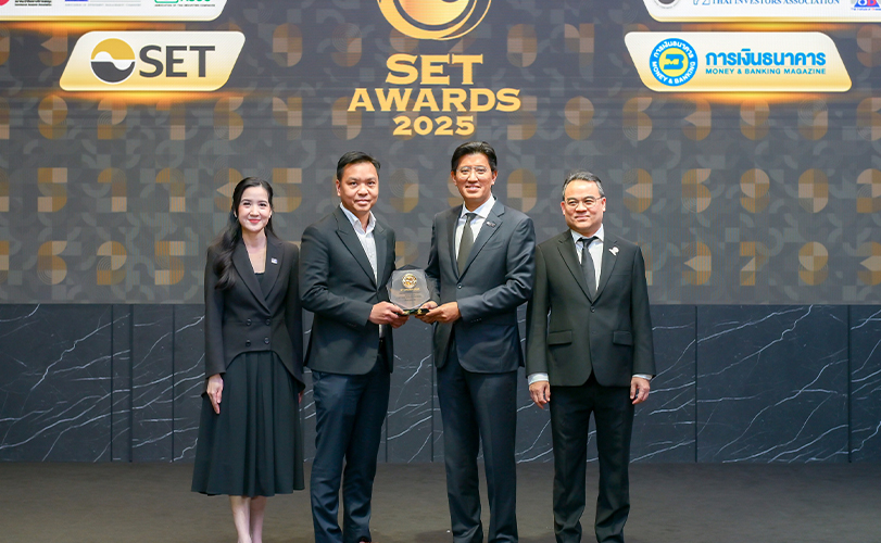 ในพิธีมอบรางวัล นางสาวนริตา อดุลย์แก้วผลึก รองประธานเจ้าหน้าที่อาวุโส และผู้อำนวยการฝ่ายนักลงทุนสัมพันธ์ เป็นผู้แทนบริษัทเข้ารับรางวัล พร้อมด้วย นายธีรภัทร์ เพ็ชรโปรี ประธานเจ้าหน้าที่ด้านการเงิน ร่วมแสดงความยินดีและถ่ายภาพเป็นที่ระลึก ณ อาคารตลาดหลักทรัพย์แห่งประเทศไทย