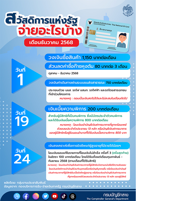 - เงินสงเคราะห์เพื่อการยังชีพแก่ผู้สูงอายุที่มีรายได้น้อยที่ได้รับสิทธิในโครงการลงทะเบียนเพื่อสวัสดิการแห่งรัฐ ปี 2565 รอบแก้ไขรายการที่โอนเงินไม่สำเร็จ ครั้งที่ 3 (ครั้งสุดท้าย) ในอัตรา 100 บาทต่อเดือน เป็นระยะเวลา 8 เดือน (เดือนกุมภาพันธ์ - กันยายน 2568) ตามเดือนที่ได้รับสิทธิ โดยจะโอนเงินเข้าบัญชีเงินฝากธนาคารที่ผู้มีสิทธิแจ้ง ตามหนังสือให้ความยินยอมโอนเงินสวัสดิการเข้าบัญชีร่วมกับบุคคลอื่นหรือบัญชีบุคคลอื่น (ยื่นหนังสือให้ความยินยอมฯ ภายในวันที่ 8 ธันวาคม 2568) หรือโอนเงินเข้าบัญชีเงินฝากธนาคารที่ผู้มีสิทธิรับเบี้ยยังชีพผู้สูงอายุ หรือโอนเงินเข้าบัญชีเงินฝากธนาคารที่ผูกพร้อมเพย์ด้วยเลขประจำตัวประชาชน 13 หลัก (ผูกพร้อมเพย์ ภายในวันที่ 19 ธันวาคม 2568)