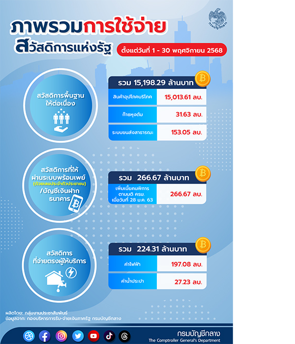 นอกจากนี้กรมบัญชีกลางขอรายงานผลการจ่ายเงินสวัสดิการแห่งรัฐ ที่จ่ายให้กับร้านธงฟ้าราคาประหยัดพัฒนาเศรษฐกิจท้องถิ่นและร้านค้าอื่น ๆ ที่กระทรวงพาณิชย์กำหนด ร้านก๊าซหุงต้ม ผู้ให้บริการระบบขนส่งสาธารณะ ผู้ให้บริการไฟฟ้าและน้ำประปา ซึ่งเป็นข้อมูลตั้งแต่วันที่ 1 - 30 พฤศจิกายน 2568 ดังนี้
