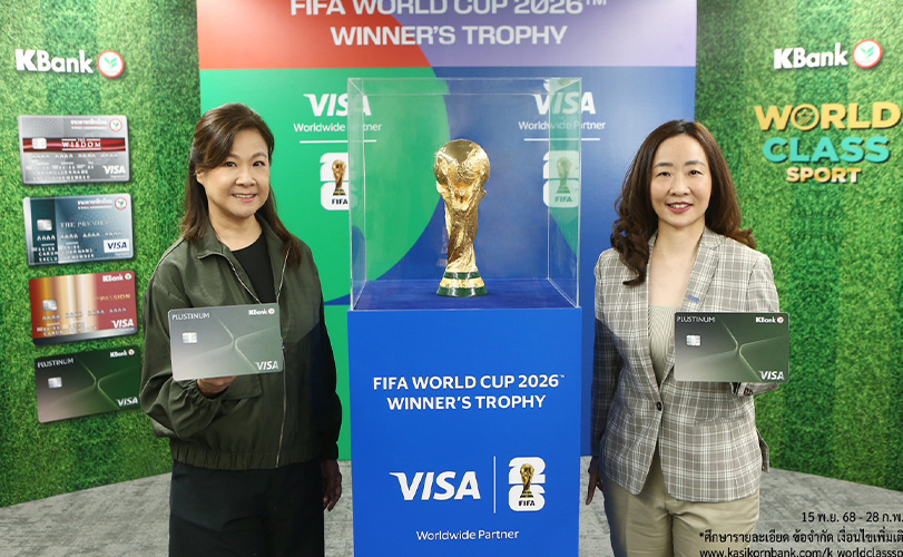 นางสาวผกาฉัตร เตชาบูรพานนท์ (ซ้าย) รองผู้จัดการใหญ่ ธนาคารกสิกรไทย และ นางสาวนพร อิงคตานุวัฒน์ (ขวา) ผู้อำนวยการอาวุโสฝ่ายการตลาด วีซ่า ประเทศไทย ร่วมส่งความสุขให้กับแฟนกีฬาและนักช้อปชาวไทย ด้วยประสบการณ์ระดับโลกกับแคมเปญ "World Class SPORT" ลุ้นบินลัดฟ้าชมฟุตบอลโลก FIFA World Cup 26™ รอบชิงชนะเลิศที่ประเทศสหรัฐอเมริกา โดยใช้จ่ายผ่านบัตรเครดิตวีซ่ากสิกรไทย ระหว่างวันที่ 15 พฤศจิกายน 2568 – 28 กุมภาพันธ์ 2569 ทุกๆ 2,000 บาท/เซลล์สลิป จะได้รับ 1 สิทธิ์ลุ้นรางวัล โดยลูกค้าต้องลงทะเบียนก่อนใช้จ่ายผ่าน K PLUS แค่ครั้งเดียวตลอดระยะเวลาแคมเปญ ที่เมนูสิทธิประโยชน์ (Privilege & Offer) เลือกแคมเปญในภารกิจสำหรับคุณ (Missions For You) เพื่อรับสิทธิ์ลุ้นรางวัลต่างๆ ต่อไปนี้