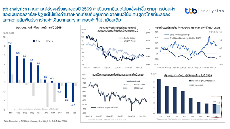 หากมองในมุมปัจจัยพื้นฐานทางเศรษฐกิจไทย แนวโน้มการเติบโตเศรษฐกิจไทยปี 2569 มีความท้าทายค่อนข้างสูง ส่งผลให้ ttb analytics คาดว่าจีดีพีของไทยจะเติบโตเพียง 1.6% ชะลอตัวลงจากปี 2568 และต่ำกว่าประเทศอื่น ๆ ในภูมิภาค ส่วนหนึ่งเป็นผลของฐานที่สูงในช่วงครึ่งแรกของปี 2568 จากอานิสงค์ของการเร่งส่งออกสินค้าไปสหรัฐฯ ก่อนภาษีนำเข้าจะเริ่มการบังคับใช้ นอกจากนี้ การส่งออกของไทยก็ยังเผชิญปัญหาเชิงโครงสร้าง ทั้งจากความสามารถในการแข่งขัน การสวมสิทธิ์สินค้าที่มาจากประเทศจีน ตลอดจนการเปลี่ยนแปลงห่วงโซ่การผลิตของโลก รวมทั้งความกังวลเกี่ยวกับเสถียรภาพการเมืองไทยที่ยังมีอยู่ หลังรัฐบาลชุดปัจจุบันมีเงื่อนไขต้องยุบสภาภายในปี 2569 ภาพดังกล่าวจะจำกัดการแข็งค่าของค่าเงินบาท และอาจเพิ่มความเสี่ยงด้านอ่อนค่ามากขึ้น โดยเฉพาะหากความสัมพันธ์ของเงินบาทและราคาทองคำลดต่ำลง