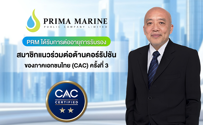 บริษัท พริมา มารีน จำกัด (มหาชน) หรือ PRM ผู้นำธุรกิจขนส่ง และการสนับสนุนทางทะเลในอุตสาหกรรมปิโตรเลียมของไทย แสดงให้เห็นถึงความมุ่งมั่นในวิสัยทัศน์ด้านความโปร่งใสอีกครั้ง หลังได้รับมอบ “ประกาศนียบัตรแนวร่วมต่อต้านคอร์รัปชันของภาคเอกชนไทย” ต่อเนื่องเป็นครั้งที่ 3 จากแนวร่วมต่อต้านคอรัปชั่นของภาคเอกชนไทย (Thai Private Sector Collective Action Against Corruption (CAC))