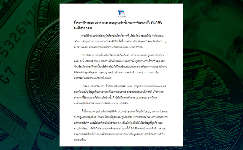 ตามที่มีกระแสข่าวปรากฏในสื่อหลักเกี่ยวกับการที่ บริษัท ไทย สมายล์ บัส จำกัด (TSB) เตรียมระดมทุนผ่านการเสนอขายโทเคนดิจิทัลเพื่อสิ่งแวดล้อม หรือ "Green Token" โดยมีการระบุถึงอัตราผลตอบแทนและการเปิดเสนอขายในช่วงเดือนเมษายน 2569 นั้น