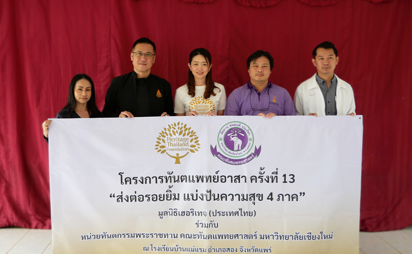 มูลนิธิเฮอริเทจ (ประเทศไทย) ภายใต้การดูแลของเครือเฮอริเทจ ผู้ผลิตและจัดจำหน่ายอาหาร และเครื่องดื่มเพื่อสุขภาพ ร่วมกับ หน่วยทันตกรรมเคลื่อนที่ คณะทันตแพทยศาสตร์ มหาวิทยาลัยเชียงใหม่ จัดทำโครงการทันตแพทย์อาสา ครั้งที่ 13 “ส่งต่อรอยยิ้ม แบ่งปันความสุข 4 ภาค” นำโดย วลัยทิพย์ ซื่อตรงมั่นคง ผู้อำนวยการฝ่ายสื่อสารองค์กรเครือเฮอริเทจ (คนกลาง), ผศ.ทพ.ดร.จิตจิโรจน์ อิทธิชัยเจริญ ผู้อำนวยการโรงพยาบาลทันตกรรม คณะทันตแพทยศาสตร์ มหาวิทยาลัยเชียงใหม่ (คนที่ 2 จากขวา), ทพญ.วิลาวรรณ จันจร กลุ่มงานทันตกรรม โรงพยาบาลสอง (ซ้ายสุด), พิเชษฐ์ ปัญญาอุด รองผู้อำนวยการสำนักงานเขตพื้นที่การศึกษาประถมศึกษาแพร่ เขต 1 (คนที่ 2 จากซ้าย), กันตพิชญ์ สีตนไชย ผู้อำนวยการโรงเรียนบ้านแม่แรม (ขวาสุด) ร่วมใจให้บริการด้านทันตกรรมแก่เด็ก ระดับปฐมวัย ระดับประถมศึกษา และระดับมัธยมศึกษา ตั้งแต่ อ.2 - ม.3 รวมถึงการให้บริการแก่ประชาชนทั่วไปในหมู่บ้านใกล้เคียง รวมจำนวนผู้เข้ารับบริการทั้งสิ้น 361 คน ได้เข้ารับบริการตรวจสุขภาพช่องปาก อาทิ เคลือบฟลูออไรด์ เคลือบหลุมร่องฟัน ขูดหินปูน อุดฟัน ถอนฟัน ฯลฯ ณ โรงเรียนบ้านแม่แรม ตำบลเตาปูน อำเภอสอง จังหวัดแพร่ โดยไม่มีค่าใช้จ่าย เพื่อสร้างโอกาสให้เด็กและชุมชนในพื้นที่ห่างไกล ได้เข้าถึงทันตกรรมอย่างแท้จริง