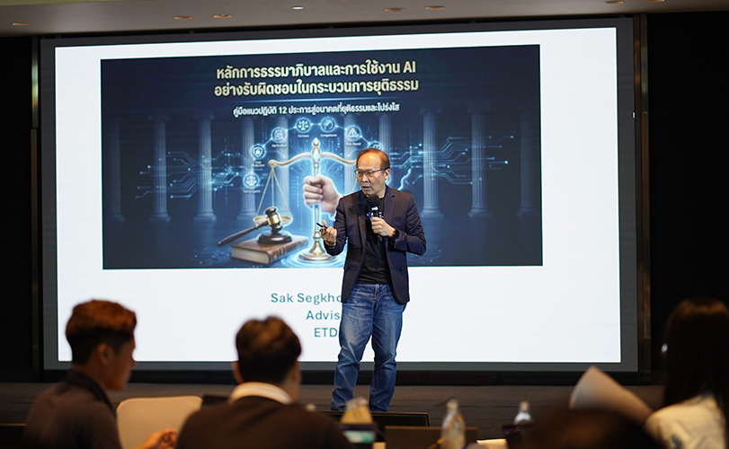 ดร.ศักดิ์ เสกขุนทด ที่ปรึกษาอาวุโส ETDA กล่าวเสริมว่า การนำ AI มาใช้ในกระบวนการยุติธรรม ถือเป็นบริบทที่มีความอ่อนไหวและมีความเสี่ยงเฉพาะสูง เนื่องจากเกี่ยวข้องโดยตรงกับสิทธิ เสรีภาพ และทรัพย์สินของประชาชน โดยความเสี่ยงสำคัญอาจเกิดจากความคลาดเคลื่อนของข้อมูล การอ้างอิงข้อกฎหมายที่ไม่ถูกต้อง อคติของระบบ ตลอดจนความเสี่ยงด้านการรั่วไหลของข้อมูลสำคัญ ซึ่งล้วนส่งผลกระทบต่อความน่าเชื่อถือของกระบวนการยุติธรรมในภาพรวม ดังนั้น ทิศทางการพัฒนาและการใช้งาน AI ในภาคส่วนนี้ จำเป็นต้องตั้งอยู่บนหลัก “Responsible AI” โดยยึดให้มนุษย์ยังคงเป็นผู้รับผิดชอบต่อผลลัพธ์อย่างเต็มรูปแบบ และไม่ใช้ AI แทนดุลพินิจในสาระสำคัญของกระบวนการยุติธรรม ขณะเดียวกัน การนำ AI มาใช้ต้องตั้งอยู่บนฐานของข้อมูลที่ผ่านการตรวจสอบจากแหล่งที่เชื่อถือได้ สามารถอธิบายเหตุผลของผลลัพธ์ได้อย่างชัดเจน และไม่พึ่งพาระบบที่ไม่สามารถตรวจสอบที่มาได้ พร้อมกันนี้ การออกแบบและใช้งาน AI ต้องคำนึงถึงความโปร่งใส โดยสามารถระบุได้อย่างชัดเจนว่า AI มีบทบาทในขั้นตอนใดของกระบวนการ มีระบบบันทึกการใช้งานเพื่อรองรับการตรวจสอบย้อนหลัง รวมถึงต้องให้ความสำคัญกับการคุ้มครองข้อมูลส่วนบุคคลและข้อมูลความลับของคดีอย่างเคร่งครัด ตลอดจนการประเมินและกำหนดกรอบการใช้งานตามระดับความเสี่ยงของงานในแต่ละประเภทอย่างเหมาะสมนอกจากนี้ ยังจำเป็นต้องเสริมสร้างความรู้ความเข้าใจของผู้ใช้งานให้ตระหนักถึงข้อจำกัดของ AI สามารถใช้งานได้อย่างเหมาะสมและเป็นกลาง รวมถึงมีแนวทางในการรับมือเมื่อเกิดความคลาดเคลื่อนของระบบ เพื่อป้องกันผลกระทบที่อาจเกิดขึ้นในเชิงระบบและสร้างความเชื่อมั่นต่อการนำเทคโนโลยีมาใช้ในระยะยาว