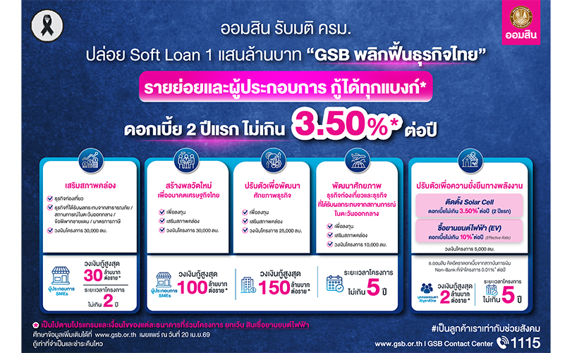 โครงการสินเชื่อดอกเบี้ยต่ำ (Soft Loan) “GSB พลิกฟื้นธุรกิจไทย” วงเงินโครงการรวม 100,000 ล้านบาท ธนาคารออมสินให้วงเงินสินเชื่อดอกเบี้ยต่ำมากแก่สถาบันการเงินและผู้ให้บริการทางการเงินอื่น ๆ ที่ไม่ใช่สถาบันการเงิน (Non – Bank) ที่เข้าร่วมโครงการ เพื่อให้ทุกรายนำวงเงินสินเชื่อนั้นไปปล่อยกู้ต่อให้กับลูกค้ารายย่อย ผู้ประกอบการ SMEs และธุรกิจขนาดใหญ่ ในอัตราดอกเบี้ย 2 ปีแรก ไม่เกิน 3.50% ต่อปี โดยเป็นไปตามโปรแกรมและเงื่อนไขที่แต่ละธนาคารกำหนด (*ยกเว้นการกู้ซื้อรถ EV) ใน 3 วัตถุประสงค์หลัก คือ 1) สินเชื่อเพื่อเสริมสภาพคล่อง 2) สินเชื่อเพื่อขยายธุรกิจ สำหรับผู้ประกอบการ SMEs และธุรกิจขนาดใหญ่ ในอุตสาหกรรมที่มีความสำคัญทางยุทธศาสตร์ และ 3) สินเชื่อกรณีปรับตัวเพื่อความยั่งยืนทางพลังงานสำหรับประชาชน โดยมีรายละเอียดสินเชื่อในกรณีต่าง ๆ ของโครงการฯ ดังนี้