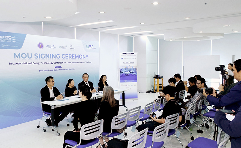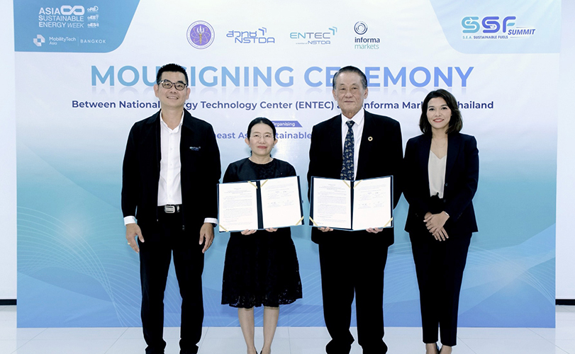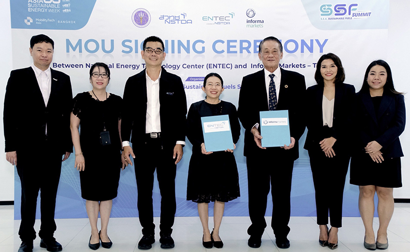 ดร.สุมิตรา จรสโรจน์กุล ผู้อำนวยการศูนย์เทคโนโลยีพลังงานแห่งชาติ (ENTEC) ภายใต้สำนักงานพัฒนาวิทยาศาสตร์และเทคโนโลยีแห่งชาติ (สวทช.) และ นายพรรธระพี ชินะโชติ ประธานร่วม อินฟอร์มา มาร์เก็ตส์ (ประเทศไทย) ได้ร่วมลงนามบันทึกข้อตกลงความร่วมมือทางวิชาการ (MOU) เพื่อร่วมจัดงาน Southeast Asia Sustainable Fuels Summit เวทีสัมมนาระดับภูมิภาคที่มุ่งเชื่อมโยงองค์ความรู้ งานวิจัย เทคโนโลยี และการลงทุนด้านเชื้อเพลิงยั่งยืนและเชื้อเพลิงทางเลือก